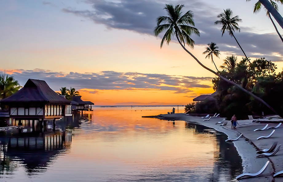 From the moment you arrive, Bora Bora feels almost unreal. The main island is encircled by a brilliant turquoise lagoon protected by a string of tiny islets, or motus, each fringed with palm trees and white sand so soft it seems to melt beneath your feet. Mount Otemanu rises like a dark emerald crown at the center, creating a dramatic backdrop that looks painted onto the sky. Here, mornings start with the gentle lapping of water beneath your bungalow, and afternoons are spent snorkeling among colorful coral gardens, spotting rays and reef sharks gliding gracefully through the shallows.